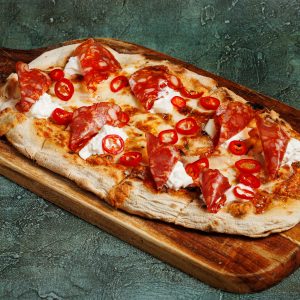 Pinsa Diavola με μοτσαρέλα bufala, chilly πιπεριά και καυτερό σαλάμι spianata